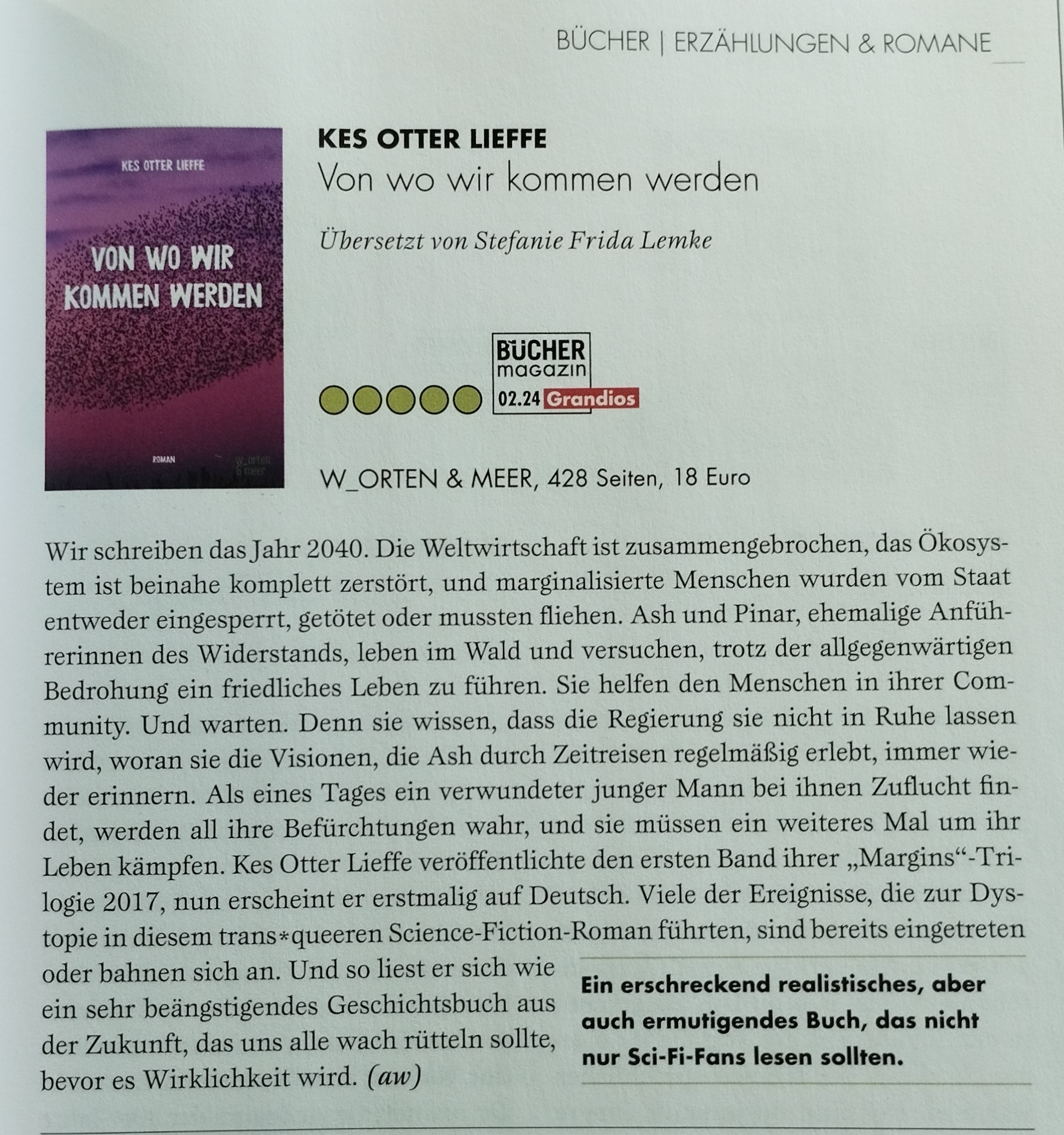 “Die dystopische Welt des Romans ist ein konsequent logisches Weiterdenken der Feindlichkeit gegenüber queeren und trans Menschen inklusive Verbot einer gendergerechten Sprache in der krisengebeutelten Welt. Aber es gibt auch Hoffnung im solidarischen Handeln. … Trans-queere SciFi-Empfehlung!”
