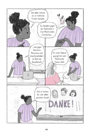 “Text sowie Illustrationen räumen gründlich auf mit projektiver Vereinnahmung und Stereotypisierung von Muslim*innen und Verunglimpfung des Islam in Deutschland. In Alltagsgeschichten 4 junge*r Muslim*innen, die verschiedener nicht sein könnten, erzählen Sirri und Kurt frisch, humorvoll und sensibel das Kaleidoskop muslimischer Identitäten, Welten, Geschichte, Themen und Communitys hierzulande, jenseits der begrenzten Vorstellungskraft des Mainstreams, und sie machen deutlich, dass auch diese Graphic Novel natürlich nur einen Ausschnitt zeigt. Junge Leser*innen finden viele Vorbilder, feministische Koranauslegungen und Tipps, Argumente und Ideen für eigenes Handeln.”