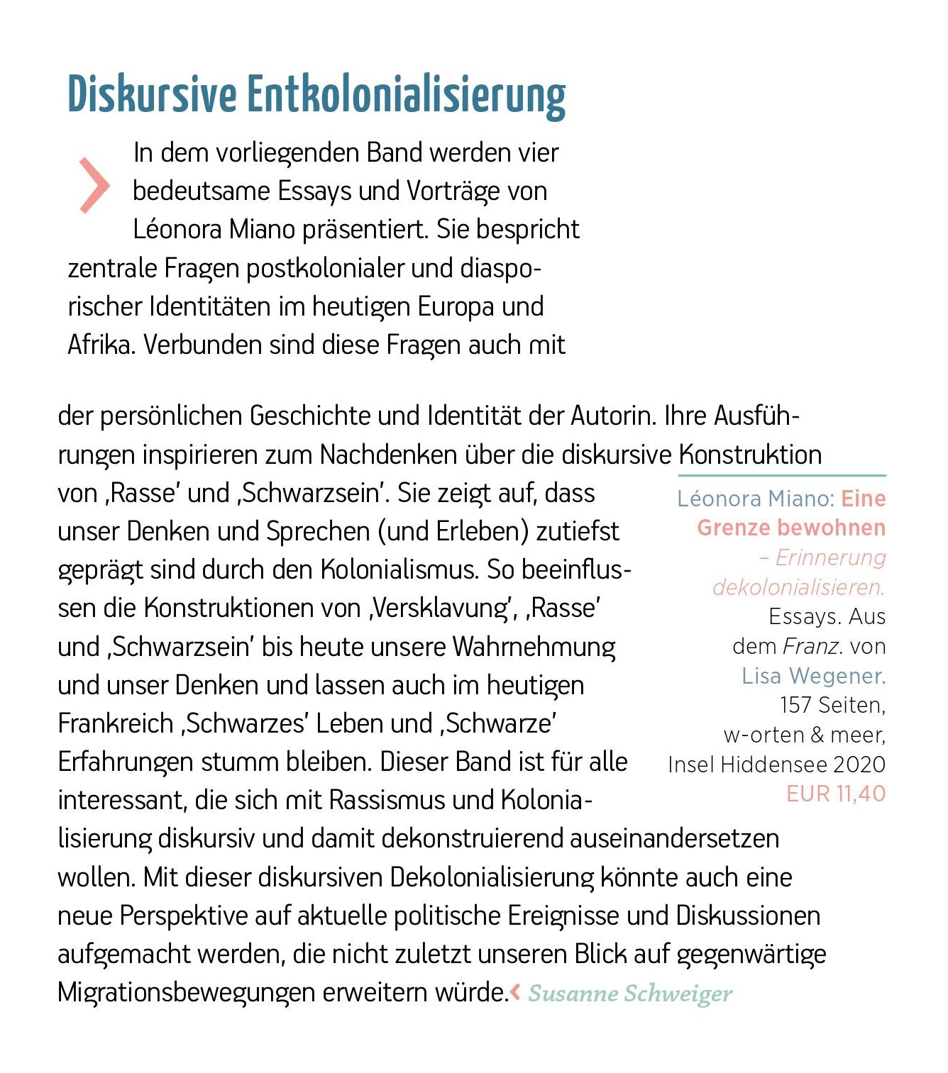 “Dieser Band ist für alle interessant, die sich mit Rassismus und Kolonialisierung diskursiv und damit dekonstruierend auseinandersetzen wollen. Mit dieser diskursiven Dekolonialisierung könnte auch eine neue Perspektive auf aktuelle politische Ereignisse und Diskussionen aufgemacht werden, die nicht zuletzt unseren Blick auf gegenwärtige Migrationsbewegungen erweitern würde.”